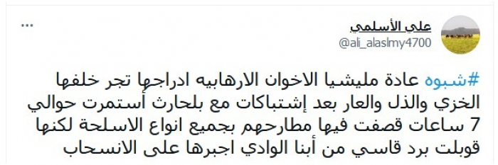 وأكد في تغريدة عبر "تويتر"، اليوم: "عادة مليشيا الإخوان الإرهابية تجر خلفها الخزي والذل والعار، بعد اشتباكات مع بلحارث".