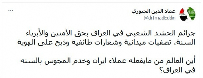 وتساءل: "أين العالم من ما يفعله عملاء إيران وخدم المجوس بالسنة في العراق؟".