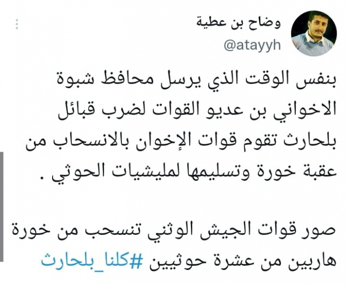 وأشار في تغريدة على حسابه بموقع التدوين المصغر تويتر، اليوم إلى المفارقة، قائلا: "بنفس الوقت الذي يرسل محافظ شبوة الإخواني بن عديو القوات لضرب قبائل بلحارث تقوم قوات الإخوان بالانسحاب من عقبة خورة وتسليمها لمليشيات الحوثي".