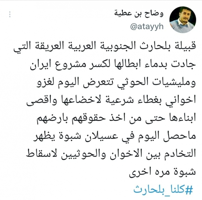 وأشار في تغريدة على حسابه بموقع التدوين المصغر تويتر، اليوم إلى أن: "قبيلة بلحارث الجنوبية العربية العريقة التي جادت بدماء أبطالها لكسر مشروع إيران ومليشيات الحوثي تتعرض اليوم لغزو إخواني بغطاء شرعية لإخضاعها وإقصاء أبناءها، حتى من أخذ حقوقهم بأرضهم".
