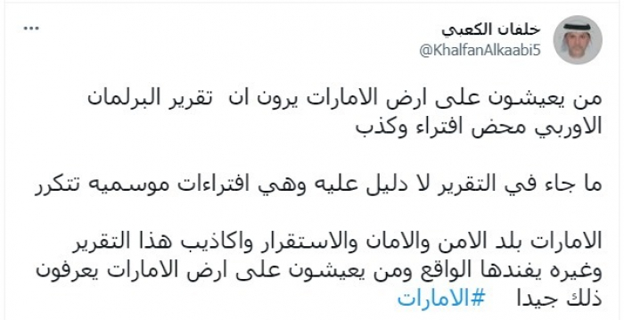 واستشهد في تغريدة عبر "تويتر"، بمن يعيشون على أرض الإمارات، قائلا: "يرون أن تقرير البرلمان الأوروبي محض افتراء وكذب".