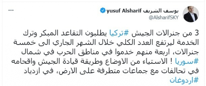 الشريف: 5 جنرالات بالجيش التركي يطلبون التقاعد لهذا السبب