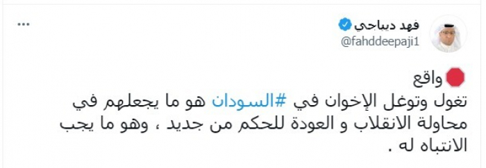 واعتبر في تغريدة عبر "تويتر"، اليوم: "تغول وتوغل الإخوان في السودان هو ما يجعلهم في محاولة الانقلاب والعودة للحكم من جديد، وهو ما يجب الانتباه له".