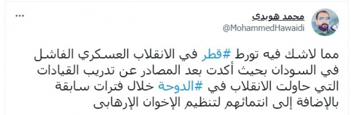 وأفصح عن هذا التورط، قائلا: "أكدت مصادر تدريب القيادات التي حاولت الانقلاب بالسودان في الدوحة خلال فترات سابقة، بالإضافة إلى انتمائهم لتنظيم الإخوان الإرهابي".