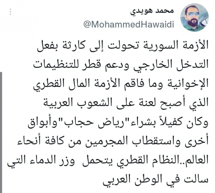 وأوضح أن: "وما فاقم الأزمة المال القطري الذي أصبح لعنة على الشعوب العربية وكان كفيلاً بشراء "رياض حجاب" وأبواق أخرى واستقطاب المجرمين من كافة أنحاء العالم".