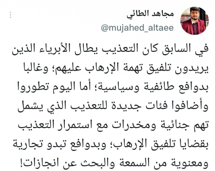 وأشار في تغريدة على حسابه بموقع التدوين المصغر تويتر، اليوم إلى أنه: "في السابق كان التعذيب يطال الأبرياء الذين يريدون تلفيق تهمة الإرهاب عليهم؛ وغالبا بدوافع طائفية وسياسية".