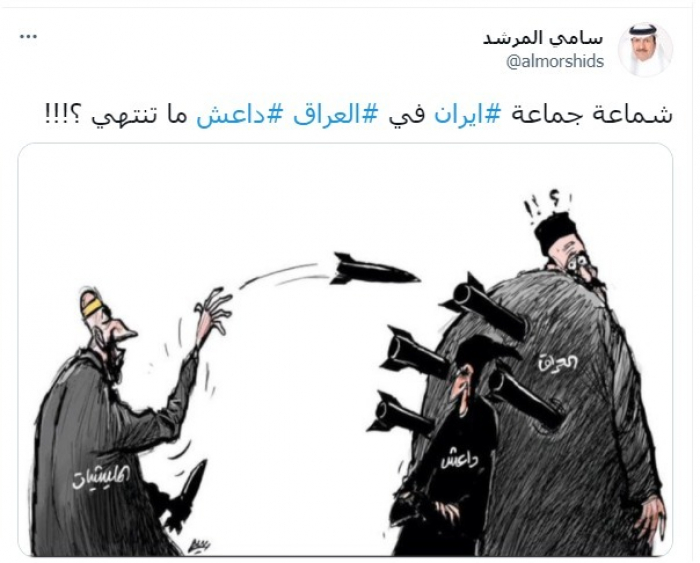 وأشار إلى مليشيات إيران في تغريدة عبر "تويتر"، اليوم: "شماعة جماعة إيران في العراق داعش ما تنتهي"، مستشهدا بكاريكاتير توضيحي لمليشيات إيران واستهدافها للعراق، بذريعة محاربة تنظيم داعش الإرهابي.