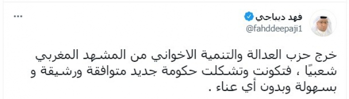 وأوضح في تغريدة عبر "تويتر"، اليوم: "خرج حزب العدالة والتنمية الإخواني من المشهد المغربي شعبيًا، فتكونت وتشكلت حكومة جديدة متوافقة ورشيقة وبسهولة وبدون أي عناء".