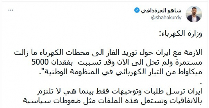 وقال نقلا عن وزارة الكهرباء العراقية: "الأزمة مع إيران حول توريد الغاز إلى محطات الكهرباء ما زالت مستمرة ولم تحل إلى الأن، وتسببت بفقدان 5000 ميجاواط من التيار الكهربائي في المنظومة الوطنية".