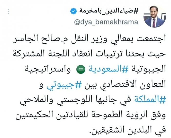 وقال في تغريدة على حسابه بموقع التدوين المصغر تويتر، اليوم إني: "اجتمعت بمعالي وزير النقل م. صالح الجاسر حيث بحثنا ترتيبات انعقاد اللجنة المشتركة الجيبوتية السعودية".