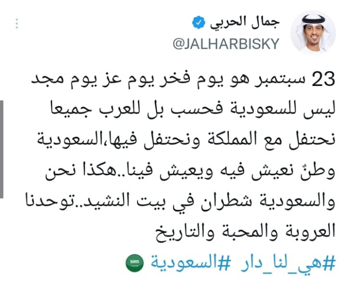وأكد في تغريدة على حسابه بموقع التدوين المصغر تويتر، اليوم أن: "23 سبتمبر هو يوم فخر يوم عز يوم مجد ليس للسعودية فحسب بل للعرب جميعا"، تابعا: "نحتفل مع المملكة ونحتفل فيها".
