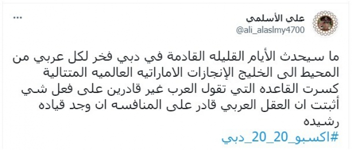 واستكمل: "أثبتت أن العقل العربي قادر على المنافسة إن وجد قيادة رشيدة"، مختتما تغريدته بهاشتاج: "إكسبو 2020 دبي".