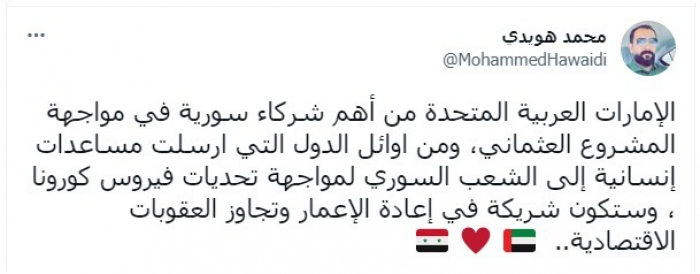 وأكد في تغريدة عبر "تويتر"، اليوم، أن: "الإمارات العربية المتحدة من أهم شركاء سوريا في مواجهة المشروع العثماني".