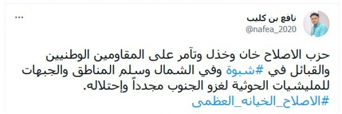 وأكد في تغريدة عبر "تويتر"، اليوم: "حزب الإصلاح خان وخذل وتآمر على المقاومين الوطنيين والقبائل في شبوة، وفي الشمال".