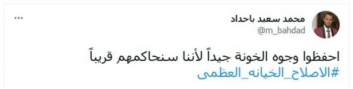 وقال في تغريدة عبر "تويتر"، اليوم: "احفظوا وجوه الخونة جيدا لأننا سنحاكمهم قريبا"، مختتما تغريدته بهاشتاج: "الإصلاح الخيانة العظمى".