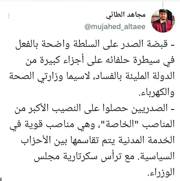 وأشار في تغريدة على حسابه بموقع التدوين المصغر تويتر، اليوم إلى أن: "قبضة الصدر على السلطة واضحة بالفعل في سيطرة حلفائه على أجزاء كبيرة من الدولة المليئة بالفساد، لاسيما وزارتي الصحة والكهرباء".