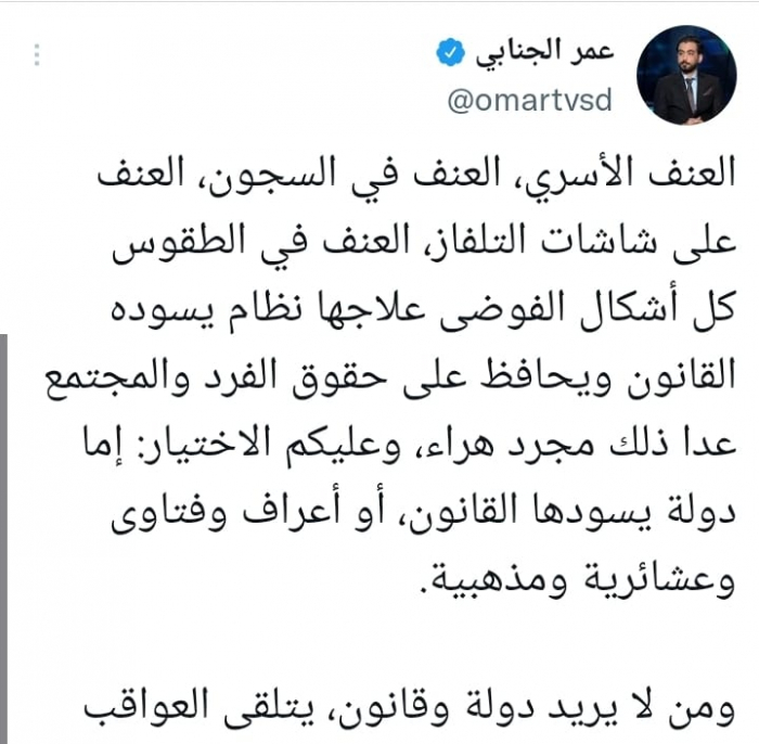 وأشار في تغريدة على حسابه بموقع التدوين المصغر تويتر، اليوم إلى: "العنف الأسري، العنف في السجون، العنف على شاشات التلفاز، العنف في الطقوس".