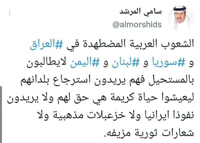 ورأى في تغريدة على حسابه بموقع التدوين المصغر تويتر، اليوم أن: "الشعوب العربية المضطهدة في العراق وسوريا ولبنان واليمن لا يطالبون بالمستحيل".