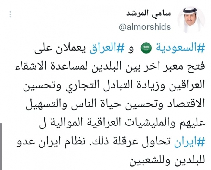 وكشف في تغريدة على حسابه بموقع التدوين المصغر تويتر، اليوم على أن: "السعودية والعراق يعملان على فتح معبر أخر بين البلدين لمساعدة الأشقاء العراقين وزيادة التبادل التجاري وتحسين الاقتصاد وتحسين حياة الناس والتسهيل عليهم".