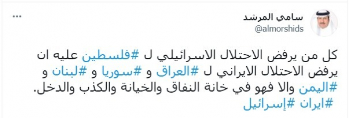 وكتب في تغريدة عبر "تويتر"، اليوم: "كل من يرفض الاحتلال الإسرائيلي لفلسطين عليه أن يرفض الاحتلال الإيراني للعراق وسوريا ولبنان واليمن".