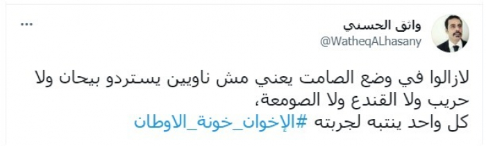 وأضاف: "كل واحد ينتبه لجربته"، مختتما تغريدته بهاشتاج: "الإخوان خونة الأوطان".