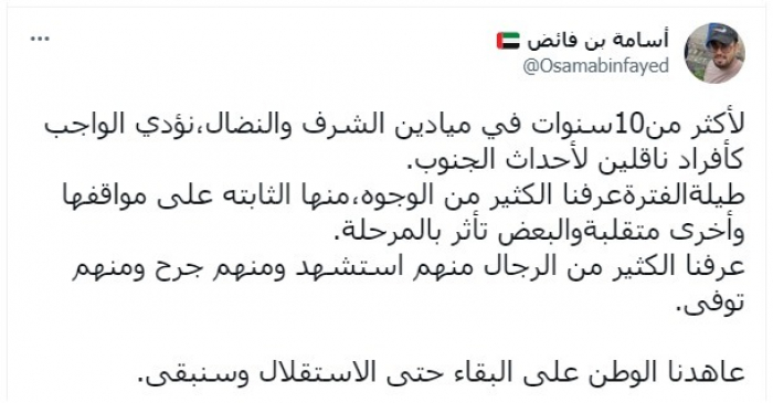 وأوضح في تغريدة عبر "تويتر"، اليوم: "لأكثر من 10 سنوات في ميادين الشرف والنضال، نؤدي الواجب كأفراد ناقلين لأحداث الجنوب".