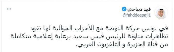 وأوضح في تغريدة عبر "تويتر"، اليوم: "في تونس حركة النهضة مع الأحزاب الموالية لها تقود تظاهرات مناوئة للرئيس قيس سعيد برعاية إعلامية متكاملة من قناة الجزيرة و التلفزيون العربي".