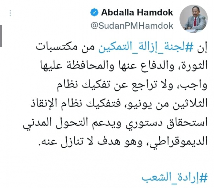 وشدد في تغريدة على حسابه بموقع التدوين المصغر تويتر، اليوم على أن: "لجنة إزالة التمكين من مكتسبات الثورة، والدفاع عنها والمحافظة عليها واجب".