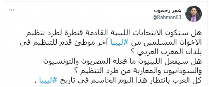 وتساءل في تغريدة عبر "تويتر"، اليوم: "هل ستكون الانتخابات الليبية المقبلة قنطرة لطرد تنظيم الإخوان من ليبيا آخر موطئ قدم للتنظيم في بلدان المغرب العربي".