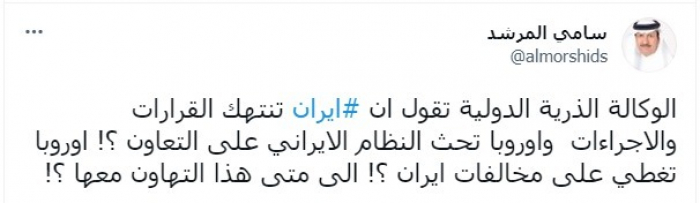 رأى المحلل السياسي السعودي سامي المرشد، أن أوروبا تتهاون مع النظام الإيراني، بالتزامن مع إعلان الوكالة الدولية للطاقة الذرية انتهاك إيران لقراراتها.