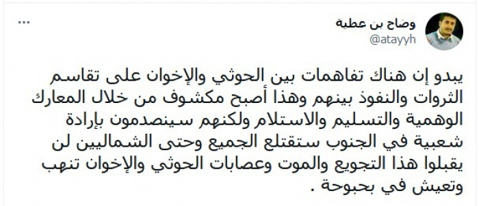 وذكر في تغريدة عبر "تويتر"، اليوم، أن: "التفاهمات بين الحوثي والإخوان على تقاسم الثروات والنفوذ بينهم أصبحت مكشوفة من خلال المعارك الوهمية والتسليم والاستلام".