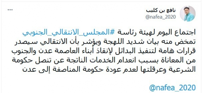 وأوضح في تغريدة عبر "تويتر"، أن: "اجتماع اليوم لهيئة رئاسة المجلس الانتقالي الجنوبي تمخض منه بيان شديد اللهجة".