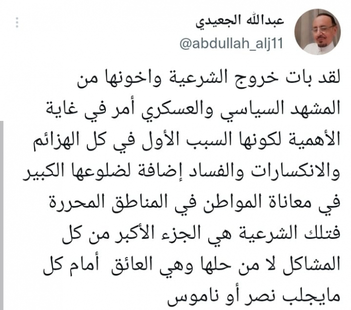 طالب الشاعر الجنوبي عبدالله الجعيدي الشرعية الإخوانية بمغادرة المشهد، لتورطها في الهزيمة أمام مليشيا الحوثي الإرهابية، وفسادها ومسؤوليتها عن أزمات الخدمات المفتعلة في الجنوب.