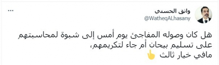 وتساءل في تغريدة عبر "تويتر"، اليوم: "هل كان وصوله المفاجئ يوم أمس إلى شبوة لمحاسبتهم على تسليم بيحان أم جاء لتكريمهم".