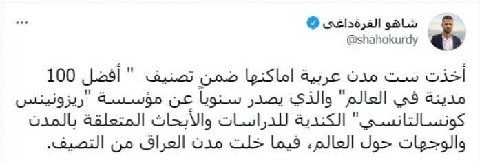 استنكر المحلل السياسي العراقي شاهو القرة داغي، خروج العراق من تصنيف قائمة أفضل 100 مدينة على مستوى العالم.