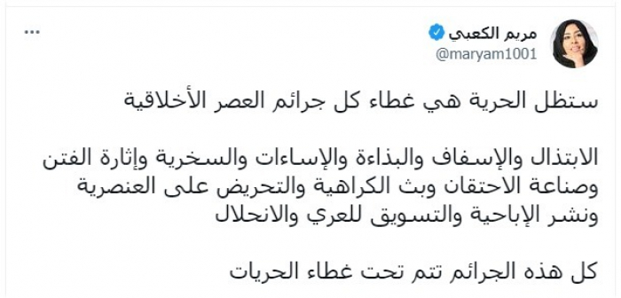 اعتبرت الكاتبة الصحفية الإماراتية مريم الكعبي، جميع الجرائم الأخلاقية في العصر الحالي، يتم ارتكابها بغطاء الحريات.