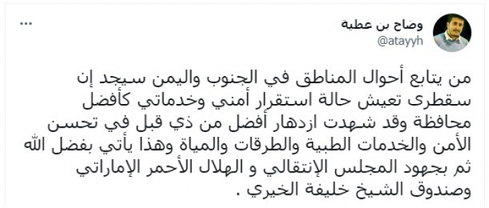 ووجه حديثه للمتابعين لأحوال المناطق في الجنوب: "سقطرى تعيش حالة استقرار أمني وخدماتي كأفضل محافظة، وشهدت ازدهارا أفضل من ذي قبل في تحسن الأمن والخدمات الطبية والطرقات والمياه".