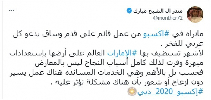 واعتبر في تغريدة عبر "تويتر"، اليوم: "ما نراه في إكسبو من عمل قائم على قدم وساق يدعو كل عربي للفخر".