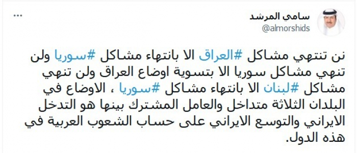 وأشار في تغريدة عبر "تويتر"، اليوم، إلى أن: "الأوضاع في البلدان الثلاثة متداخلة والعامل المشترك بينها التدخل الإيراني".