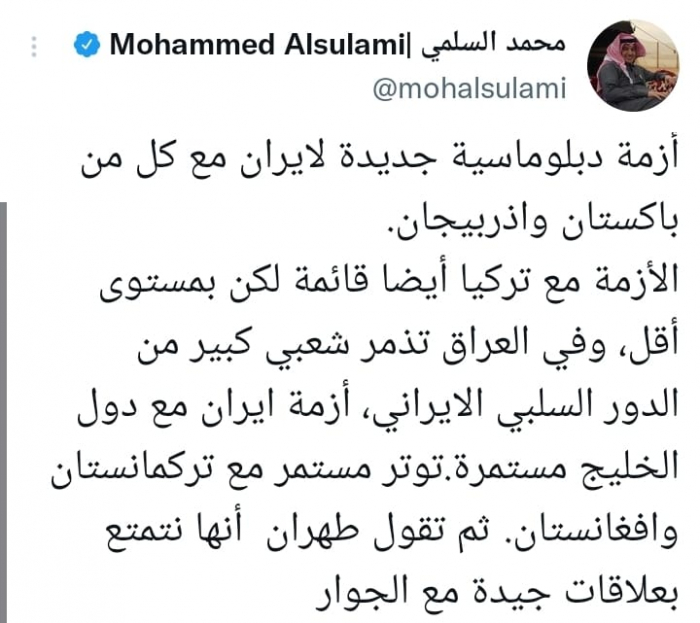 وكشف في تغريدة على حسابه بموقع التدوين المصغر تويتر، اليوم أن هناك: "أزمة دبلوماسية جديدة لايران مع كل من باكستان وأذربيجان".