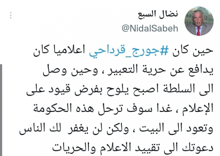 وأكد في تغريدة على حسابه بموقع التدوين المصغر تويتر، اليوم أنه: "حين كان جورج قرداحي إعلاميا كان يدافع عن حرية التعبير، وحين وصل إلى السلطة أصبح يلوح بفرض قيود على الإعلام".