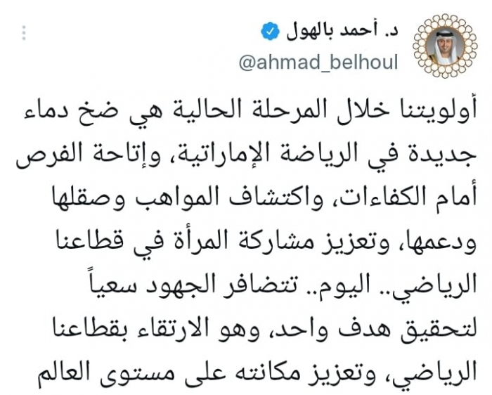 وكشف في تغريدة على حسابه بموقع التدوين المصغر تويتر، اليوم أن: "أولويتنا خلال المرحلة الحالية هي ضخ دماء جديدة في الرياضة الإماراتية، وإتاحة الفرص أمام الكفاءات، واكتشاف المواهب وصقلها ودعمها، وتعزيز مشاركة المرأة في قطاعنا الرياضي".