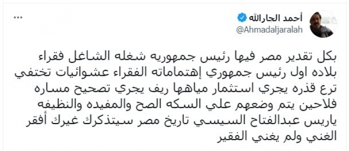 وقال في تغريدة عبر "تويتر"، اليوم: "بكل تقدير مصر فيها رئيس جمهورية شغله الشاغل فقراء بلاده، أول رئيس جمهوري اهتماماته الفقراء".