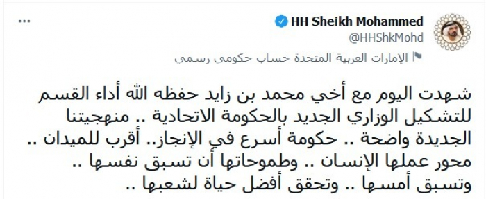 وكتب الشيخ محمد بن راشد في تغريدة عبر "تويتر": "شهدت اليوم مع أخي محمد بن زايد حفظه الله أداء القسم للتشكيل الوزاري الجديد بالحكومة الاتحادية".