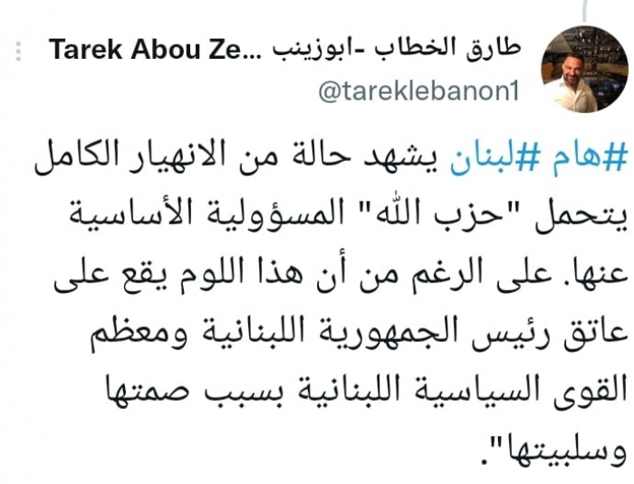 وشدد في تغريدة على حسابه بموقع التدوين المصغر تويتر، اليوم على أن: "لبنان يشهد حالة من الانهيار الكامل يتحمل "حزب الله" المسؤولية الأساسية عنها".