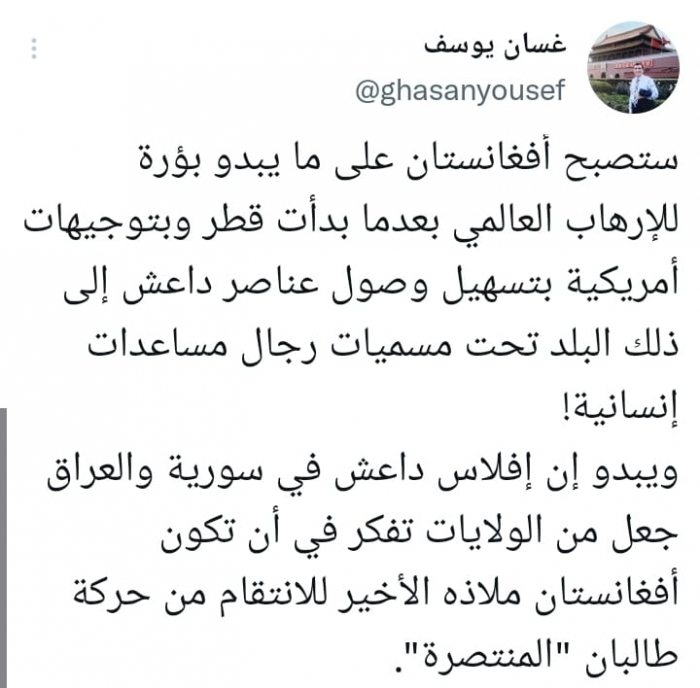 وأكد في تغريدة على حسابه بموقع التدوين المصغر تويتر، اليوم أنه: "ستصبح أفغانستان على ما يبدو بؤرة للإرهاب العالمي بعدما بدأت قطر وبتوجيهات أمريكية بتسهيل وصول عناصر داعش إلى ذلك البلد تحت مسميات رجال مساعدات إنسانية".