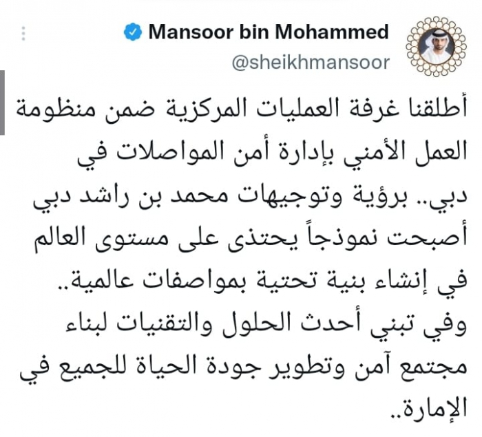 وكشف في تغريدة على حسابه بموقع التدوين المصغر تويتر، اليوم أننا: "أطلقنا غرفة العمليات المركزية ضمن منظومة العمل الأمني بإدارة أمن المواصلات في دبي".