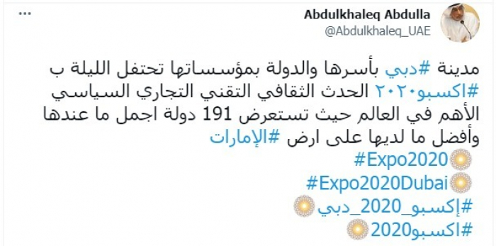 واختتم تغريدته بهاشتاجي: "إكسبو 2020، إكسبو 2020 دبي".