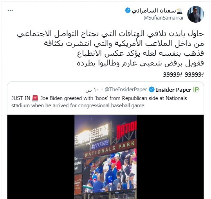 وروي في تغريدة عبر "تويتر"، اليوم، ما تعرض له بايدن، قائلا: "حاول تلافي الهتافات التي تجتاح التواصل الاجتماعي من داخل الملاعب الأمريكية والتي انتشرت بكثافة".