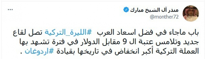 اعتبر المدون السعودي منذر آل الشيخ مبارك، أن سياسات النظام التركي وعلى رأسه أردوغان، وراء الانهيار الكبير في الليرة التركية، بالتزامن مع ملامستها عتبة 9 دولارات.